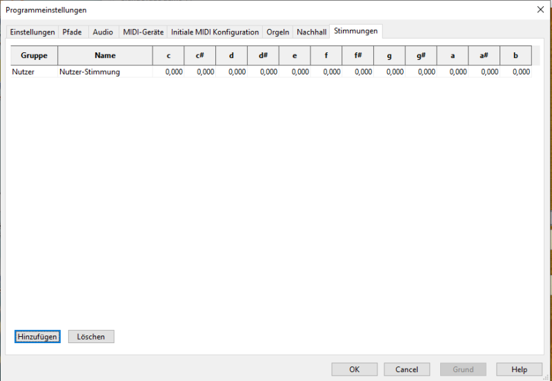 Name Legt die Bezeichnung des Menüpunkts fest. c, c# … b Eine Spalte für jeden Hinweis der Skala definiert die Abweichung in Cent von der gleichschwebenden Stimmung für diesen Hinweis.