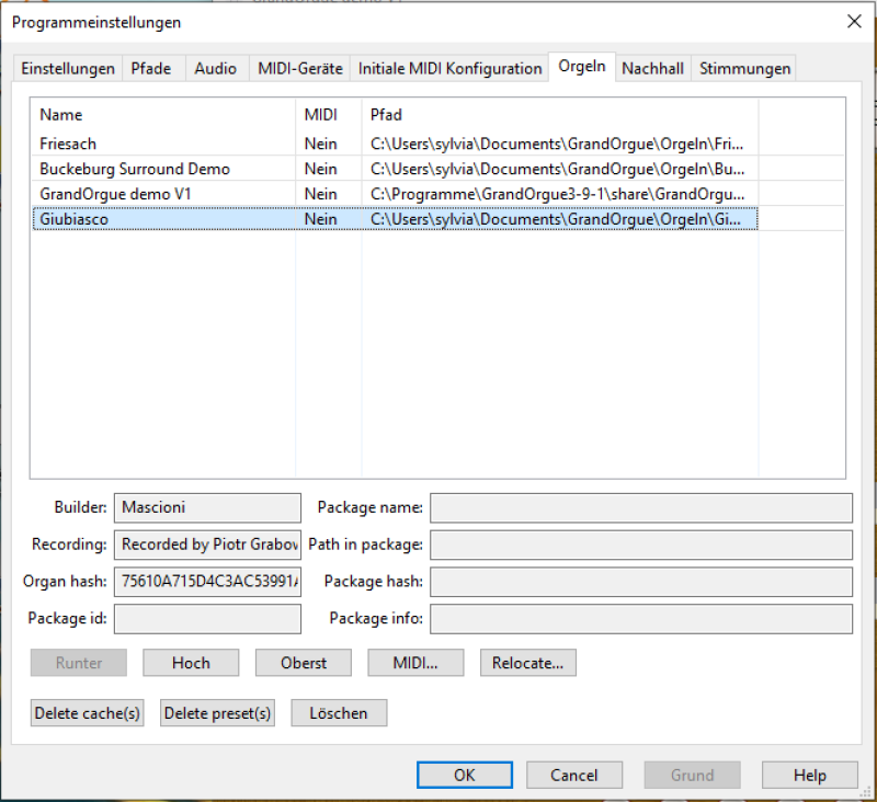 Relocate (Verlagern): Mit relocate lässt sich das Organ package *.orgue in einem alternativen Verzeichnis abspeichern.