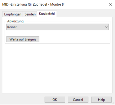 Warten auf Ereignis Löst den Empfangsmodus aus. GrandOrgue wartet darauf, dass eine Taste auf der Computertastatur gedrückt wird, und setzt dann das Dropdown auf diese Taste.